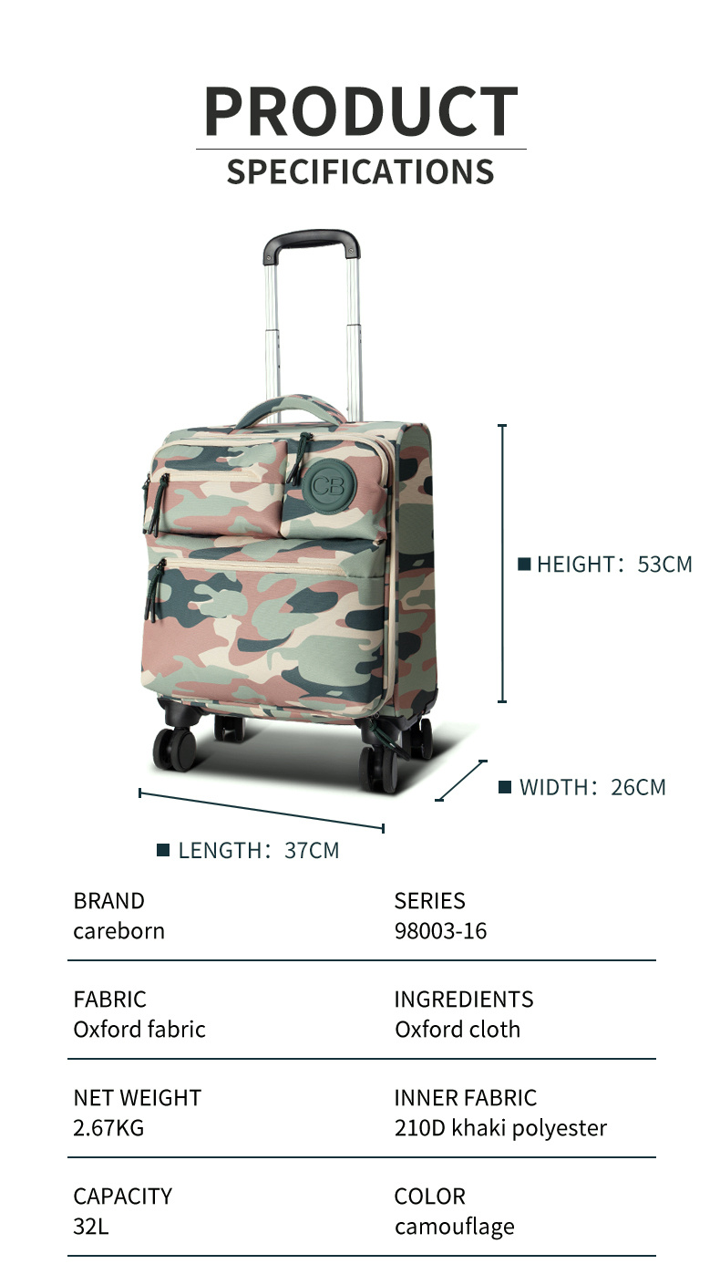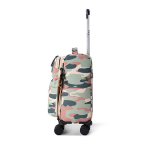 The perfect travel accessory for the cool and stylish traveler! The pink and green camouflage pattern creates a unique personality, while the rugged camouflage meets the soft macaron color, breaking away from the dullness of traditional suitcases. With its multi-pocket functional design and lightweight body, it’s both a trendy accessory for creating a stylish look and a practical carry-on suitcase that can hold a laptop and camera.