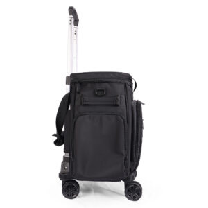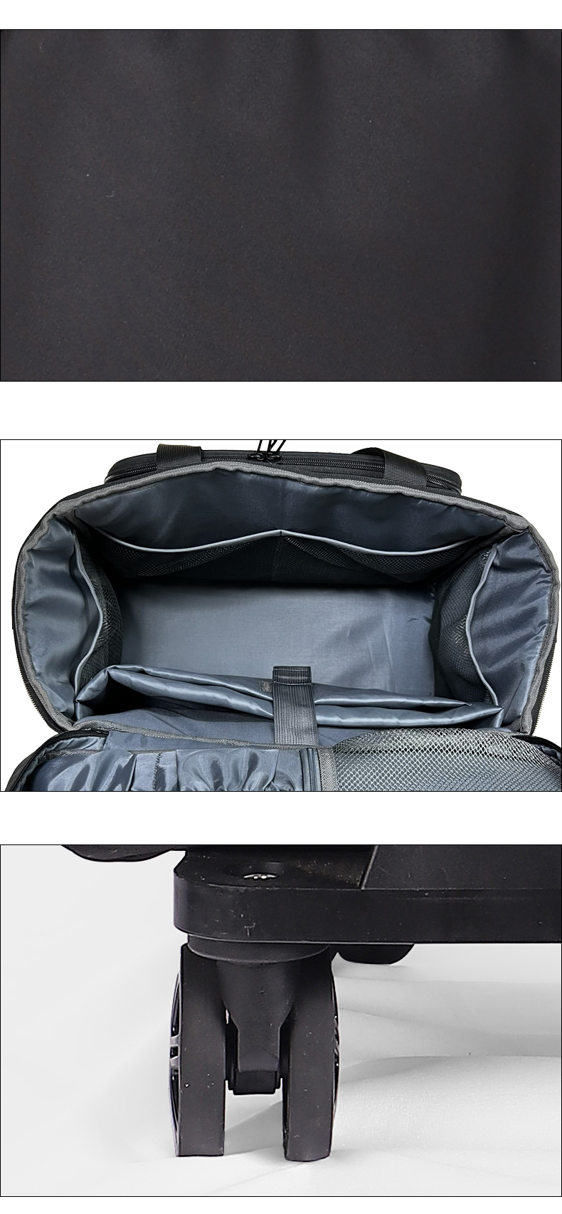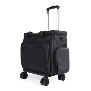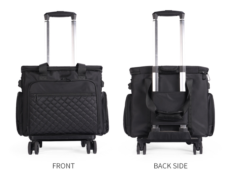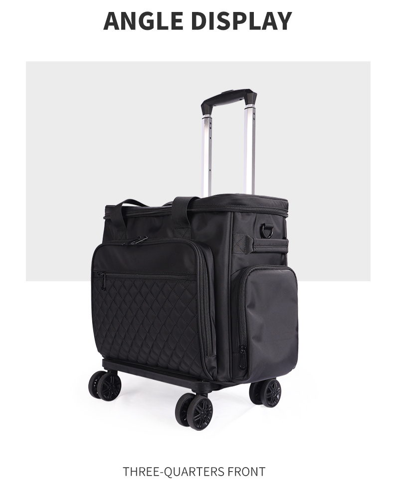 The main compartment offers ample space, capable of holding a large quantity of items such as clothing, cosmetics, or tools, making it suitable for short trips or professional use (e.g., by makeup artists or nail technicians). The exterior features a diamond-patterned, wear-resistant fabric (such as Oxford cloth or nylon), which is water-repellent and tear-resistant, ensuring durability for daily use and effective protection for the contents inside. When the telescopic handle is retracted, the bag can be transformed into a spacious tote via the top carry handle, allowing seamless transition from luggage to handheld use indoors.